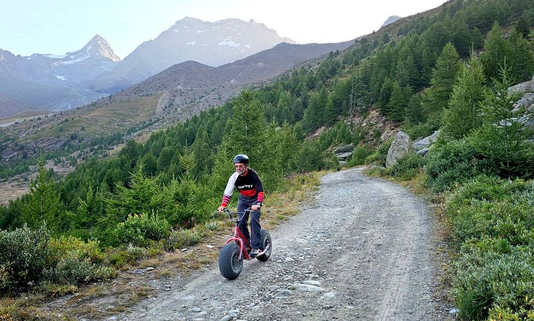 Am letzten Tag ließen wir es entspannter angehen: Das Frühstück war erst um 6:30 Uhr angesagt. Beim Abstieg entschieden wir uns dann spontan, ab Kreuzboden die restliche Strecke nach Saas-Grund nicht zu Fuß, sondern auf sogenannten „Monstertrottis“ – große Roller mit großen Reifen – zurückzulegen.