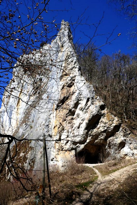 Unten war nun wieder die Felsbrocken-Brücke zu sehen, die wir am Vortag ja „wagemutig“ überschritten hatten, bevor uns der „Blitz traf“. Aber wir wollten nicht ins Tal, sondern es ging nun in Serpentinen wieder hinauf zum Fuß des mächtigen Felsen auf dem das Schloss Bronnen stand. Hier war auch die mächtige „Bronnenhöhle“.