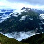Dann hörte auf zu regnen, dichte Wolkenpakete schoben sich vom Tal hoch. Der Boden dampfte. So entschieden wir uns für einen Schlenker aufs Sonntagsköpfl, bevor wir zur Adolf Pichler Hütte absteigen.
