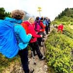 Gewandert wurde auch – nach Anfahrt per Bahn und Bus von Rottenburg nach Fulpmes. Doch zuerst hieß es Höhe gewinnen. Und so starteten wir am Samstag mit der Kreuzjochel-Seilbahn. Oben angelangt, war ein zügiger Aufstieg zur Starkenburger Hütte angesagt, das nächste Regenfeld schon im Nacken.