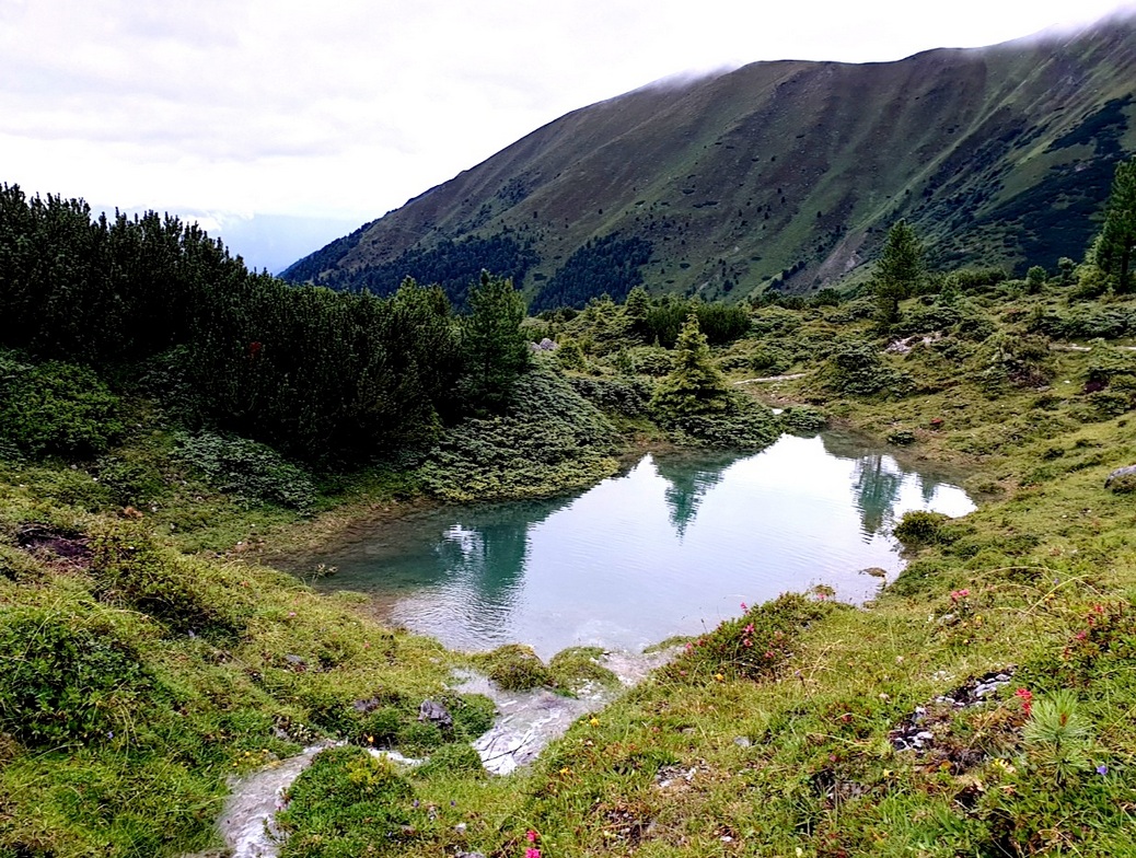 Kurz vor der Hütte jedoch: Ha, schon wieder Regen! Wir wurden nass. Aber egal. Auf der Adolf Pichler Hütte waren wir die einzigen Übernachtungsgäste. Im Trockenraum bollerte ein Radiator, hier wollte man bleiben. In der Gaststube war’s aber auch gemütlich. Marillenstrudel und Kaffee stimmen uns schnell versöhnlich. So, dass sich später – in der nächsten Regenpause – Freiwillige fanden, um nackt in den eiskalten Bergsee zu hüpfen.