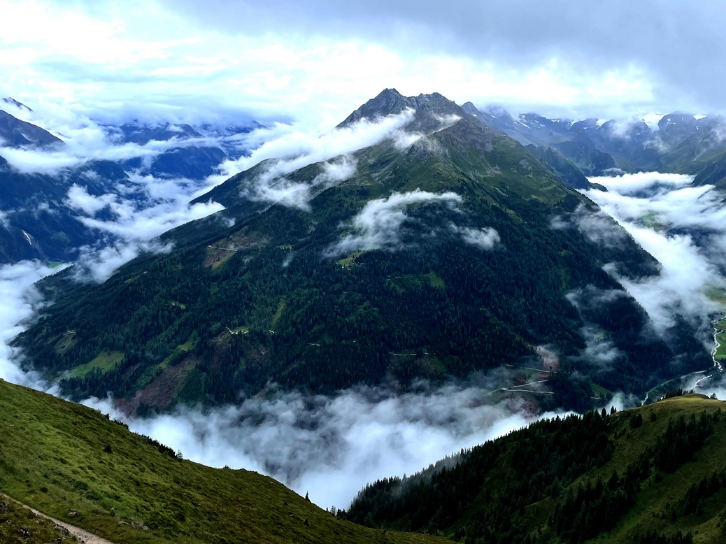Dann hörte auf zu regnen, dichte Wolkenpakete schoben sich vom Tal hoch. Der Boden dampfte. So entschieden wir uns für einen Schlenker aufs Sonntagsköpfl, bevor wir zur Adolf Pichler Hütte absteigen.