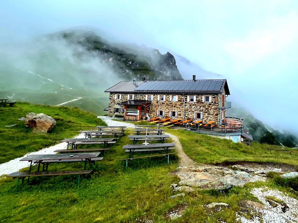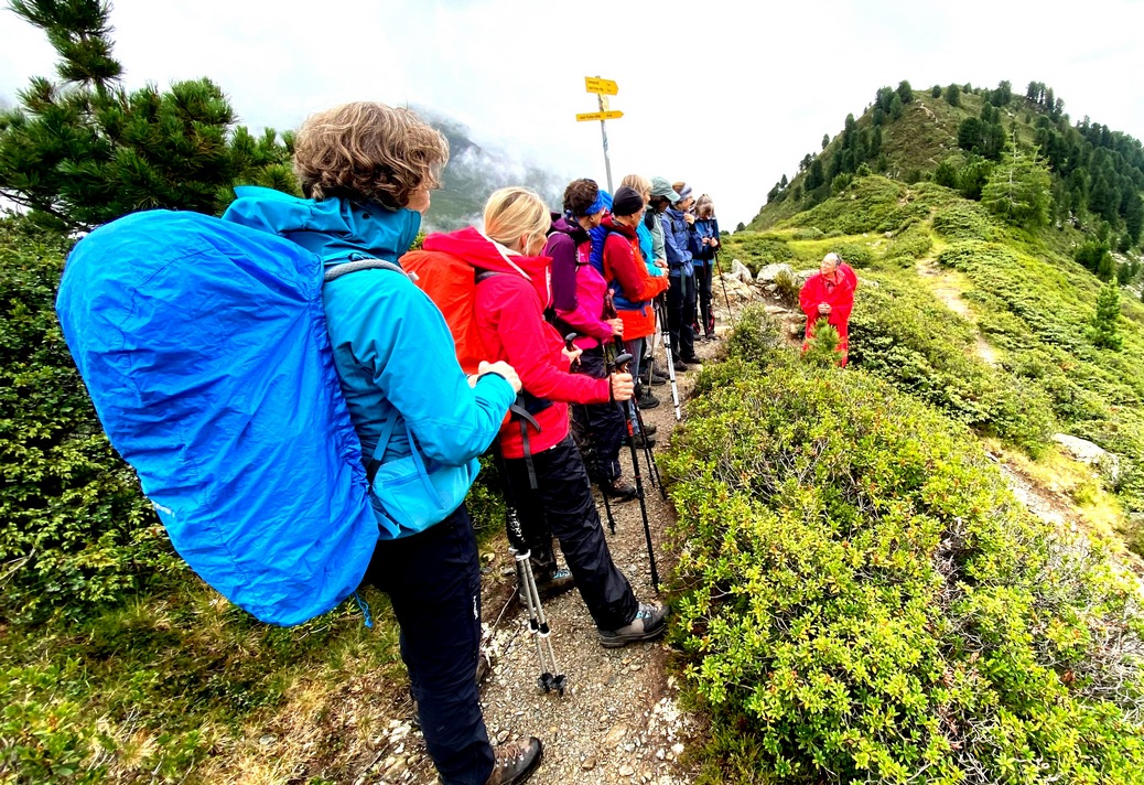 Gewandert wurde auch – nach Anfahrt per Bahn und Bus von Rottenburg nach Fulpmes. Doch zuerst hieß es Höhe gewinnen. Und so starteten wir am Samstag mit der Kreuzjochel-Seilbahn. Oben angelangt, war ein zügiger Aufstieg zur Starkenburger Hütte angesagt, das nächste Regenfeld schon im Nacken.