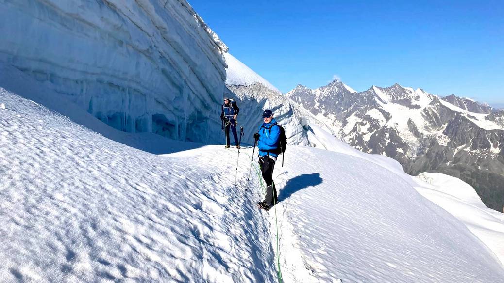 Hochmotiviert starteten wir am Montag von der Weissmieshütte hinauf zum Bergrestaurant Hohsaas und gelangen über ein Geröllfeld zum flachen Rücken des Triftgletschers. Nach dem Queren, kamen wir über eine seilversicherte Steilstufe in die Gletscherwand. Durch große, teilweise offene Spalten stiegen wir in Eis und Firn (bis 40 Grad) hinauf zum Westgipfel und genossen bei einer Pause die ersten Sonnenstrahlen des Tages.