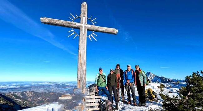 Bei schönstem Sonnenschein gab es eine kleine Verschnaufpause an der Kammeregg-Alpe. Die Schneeschuhe hatten wir wie die vergangenen Tage auch größtenteils auf den Rucksack geschnallt. Für die letzten Höhenmeter zum Gipfel, wünschten wir uns jedoch sehnlichst Grödel herbei. Durch das warme Wetter war der Schnee angetaut und der Weg zum Teil rutschig und glatt, was für manche Teilnehmer zu einer mentalen Herausforderung wurde. Aber dafür wurden wir oben mit einem wahnsinnigen Ausblick belohnt.