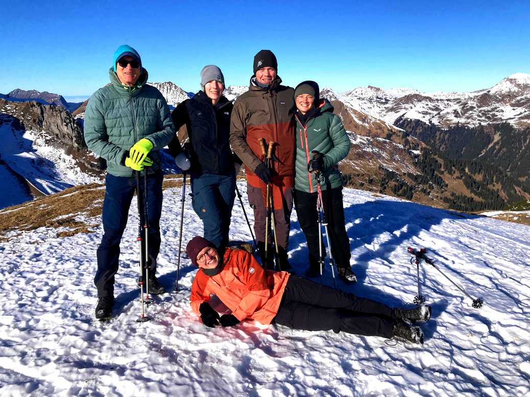 Bei schönstem Sonnenschein gab es eine kleine Verschnaufpause an der Kammeregg-Alpe. Die Schneeschuhe hatten wir wie die vergangenen Tage auch größtenteils auf den Rucksack geschnallt. Für die letzten Höhenmeter zum Gipfel, wünschten wir uns jedoch sehnlichst Grödel herbei. Durch das warme Wetter war der Schnee angetaut und der Weg zum Teil rutschig und glatt, was für manche Teilnehmer zu einer mentalen Herausforderung wurde. Aber dafür wurden wir oben mit einem wahnsinnigen Ausblick belohnt.