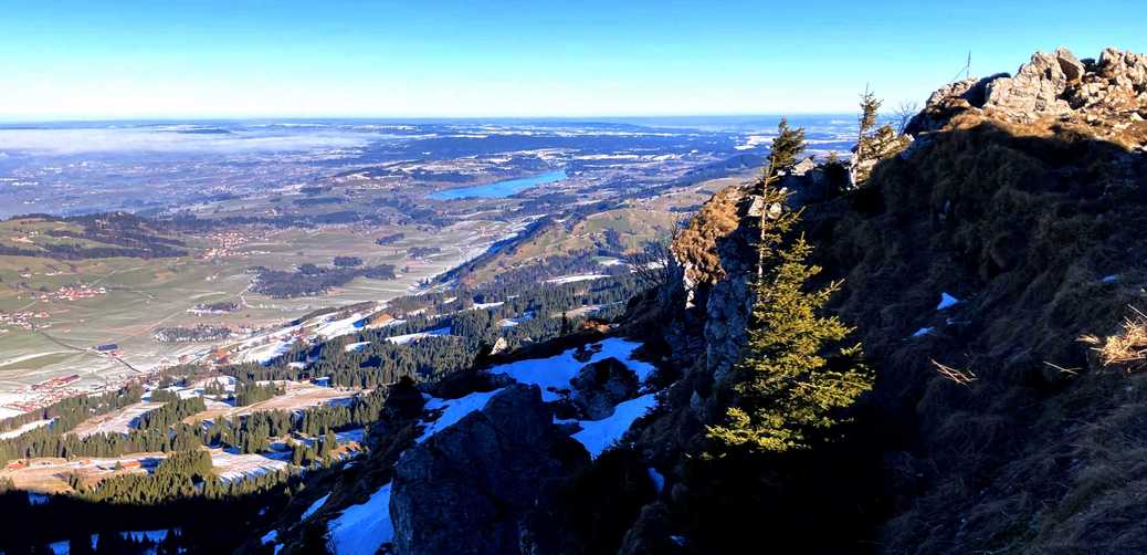 Am Gipfel angekommen, hatten wir einen schönen Ausblick ins Tannheimer Tal und unser Vesper verdient. Auf dem Rückweg legten wir noch einen kurzen Halt an der Bergstation ein, wo es Bier, Almdudler und Kaiserschmarren gab. Der Weg über die Piste ins Tal machte anschließend auch endlich den Einsatz der Schneeschuhe nötig und möglich, um in den steileren Passagen nicht abzurutschen.