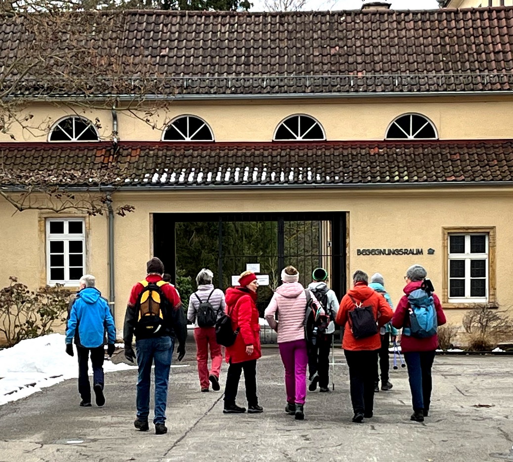 Weiter ging es, die „Pfleiderer-Stäffele“ hinab, vorbei am Lapidarium zur Mittagspause in die Dinkelacker-Gaststätte. Gut gestärkt nahmen wir vom Marienplatz die Zacke-Bahn hoch zum Ausstieg “Haigst“ und blickten am „Santiago de Chile-Platz“ in den Stuttgarter Osten. Nun begann unsere Wanderung auf dem „Blaustrümpfler-Weg“ zum Waldfriedhof. Dort besuchten wir einige Gräber der vielen Persönlichkeiten, die dort begraben sind.