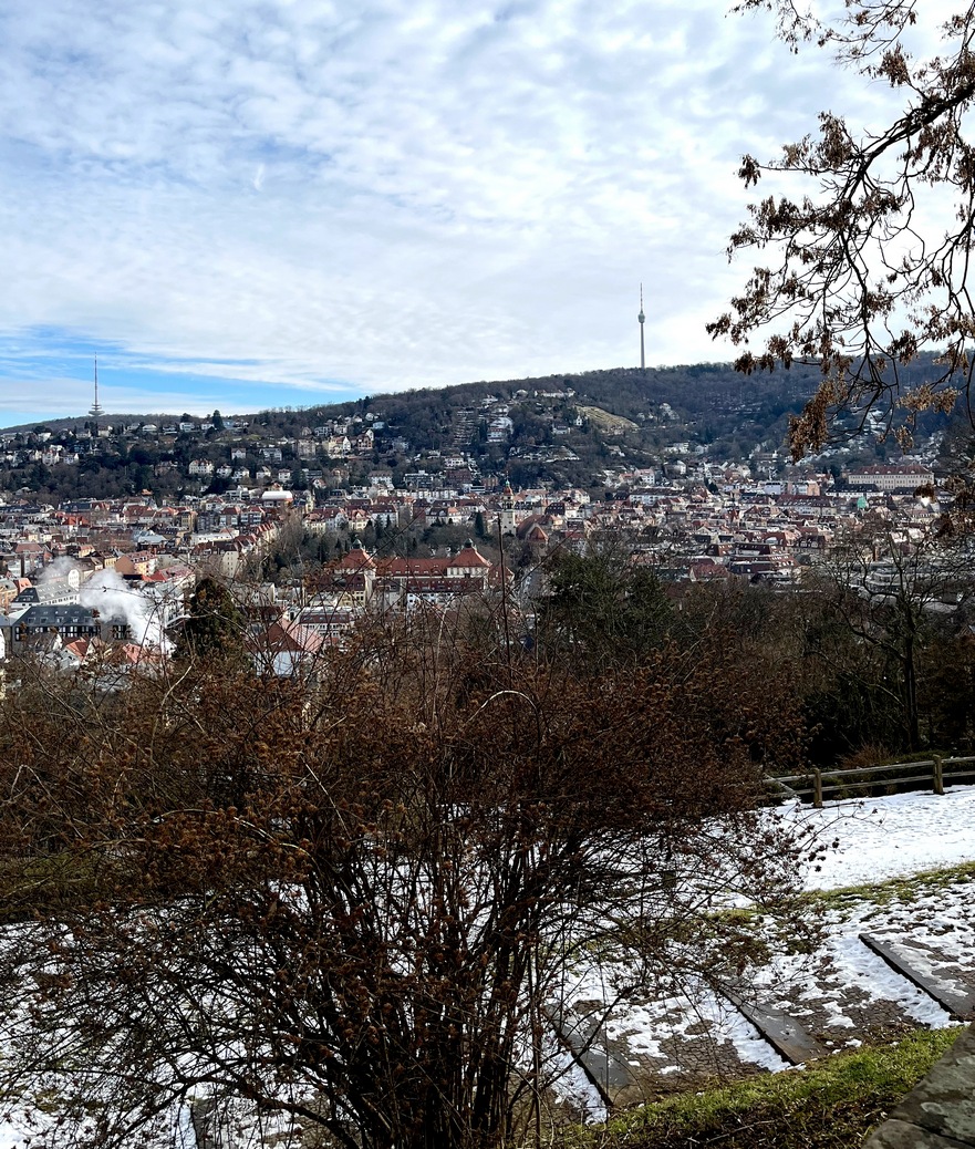 Die Deutsche Bahn brachte uns (relativ) pünktlich nach Stuttgart und die S-Bahn zur Station am Feuersee. Dort begann die Wanderung zur Karlshöhe, über schneebedeckte, glatte Wege und vorbei am Athene-Brunnen. Die Sonne kam hervor und wir hatten von der Terrasse der Karlshöhe einen schönen Blick auf Stuttgart Süd und den Fernsehturm.