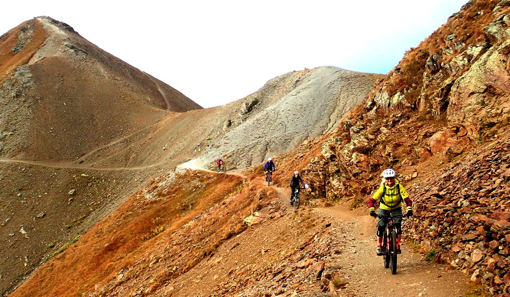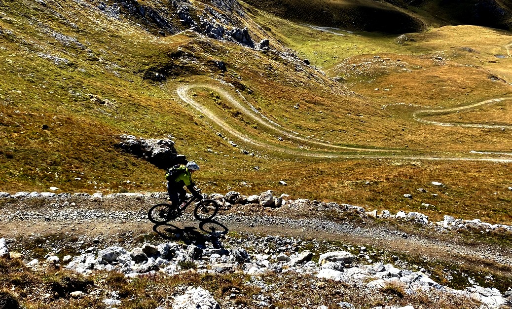 Start der Tour war auf der Dreisprachen-Spitze am Stilfser Joch, die wir (zum Glück) mit einer Shuttle-Hilfe erklimmen konnten. Vorbei am bekannten Goldsee (eine unscheinbare Pfütze, aber immerhin Namensgeber für den wahrscheinlich bekanntesten Trail im Vinschgau) ging´s in die eigentliche „Bim-Bam-Passage“. Leider wird dieser immer ausgesetzter. Mittlerweile hat man es mit hohen Stufen zu tun, die ganz schön fordernd sind.
