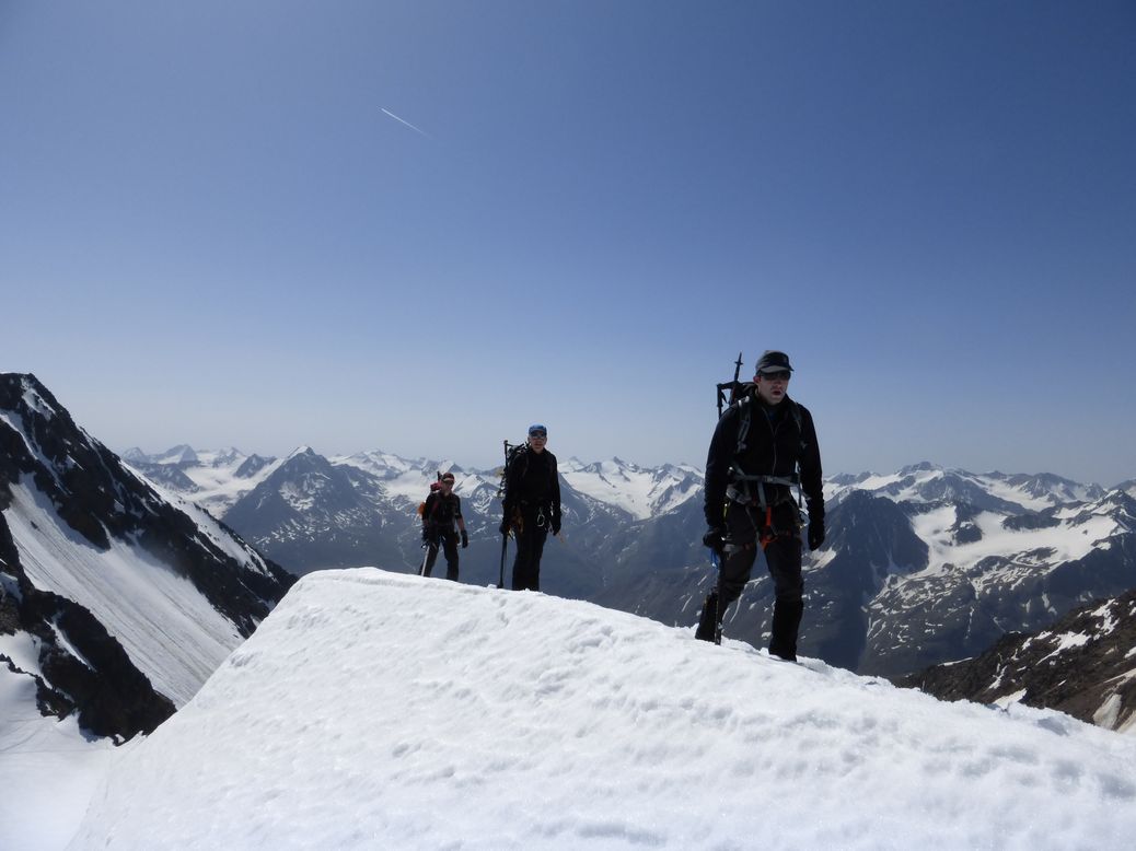 Über den Südostgrat nahmen wir nun den Gipfel in Angriff, abwechselnd über Gestein und Firnfelder. Um ca. 10.30 Uhr war es dann geschafft und wir setzten uns zu einer kurzen Rast in den Schnee, um den Ausblick über die österreichische und italienische Bergwelt zu genießen.