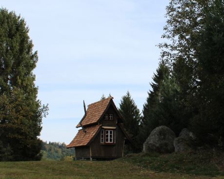 An der nächsten Station – dem „Hexenhaus am Hexensteig“ – staunten viele über das verwunschene Hexenhäuschen. Nach einer kurzen Besichtigung mit Gruppenfoto ging es abwärts über das “Simmersbacher Kreuz“ weiter zur Bergvesperstube „Zum Fiesemichel“. Ein großes Holzfass vor der Vesperstube, genannt „Krabba Nescht“, war ein begehrtes Fotomotiv. Nach einer längeren Einkehr ging es zunächst nochmals leicht bergauf, bevor dann der steile Abstieg ins Renchtal erfolgte.